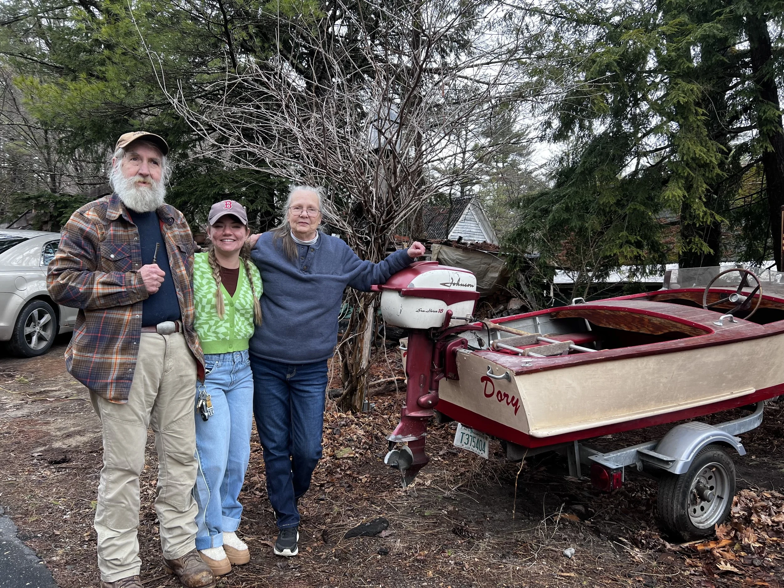 Over a decade passed. Grandpa Dan grew ill with cancer. I moved from Florida back home to Massachusetts to be near him and support our family. A few weeks ago (April 2025), after an emotional visit with him, my mom and I went for a drive. Something caught my eye—a tarp flapping in the wind. Underneath, I saw the word “Dory.” I leapt from the car and ran into this stranger’s yard. And there she was. Hunky Dory. Our boat.